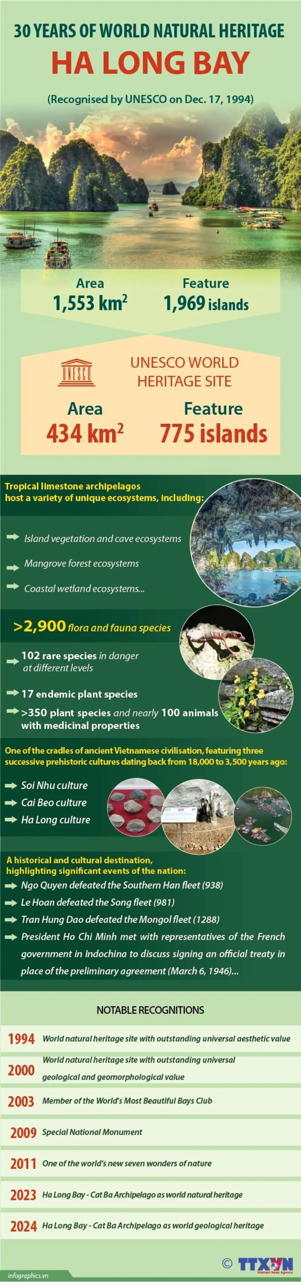 30 years ago, on December 17, 1994, Ha Long Bay was officially recognized as a UNESCO World Heritage site for the first time during an event in Thailand. This milestone marked the beginning of a journey towards numerous prestigious accolades for Ha Long Bay, including recognition for its geological and geomorphological value, designation as a National Special Monument, its place among the New 7 Wonders of Nature, among others.