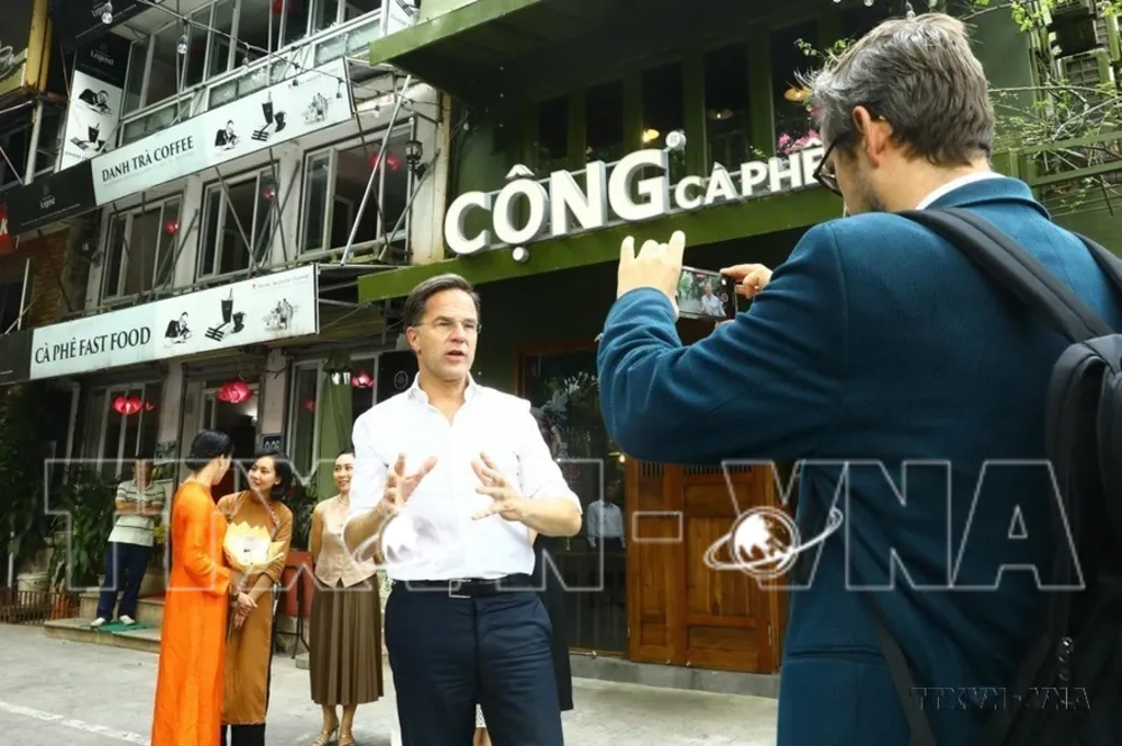 Hanoi is a city where leaders from around the world enjoy a peaceful atmosphere. In the photo: During his visit to Vietnam on November 2, 2023, Dutch Prime Minister Mark Rutte visits a cafe on Dien Bien Phu street, savoring tea and engaging in conversation with Vietnamese friends.__Photo: VNA