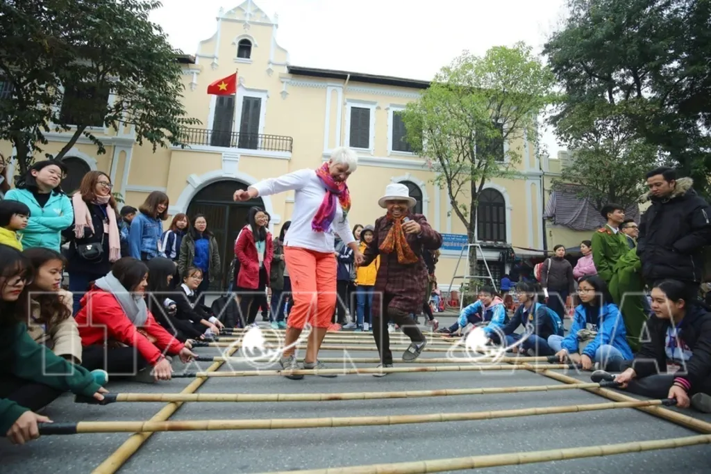 International tourists participate in cultural activities at Hoan Kiem pedestrian street in Hanoi.__Photo: VNA