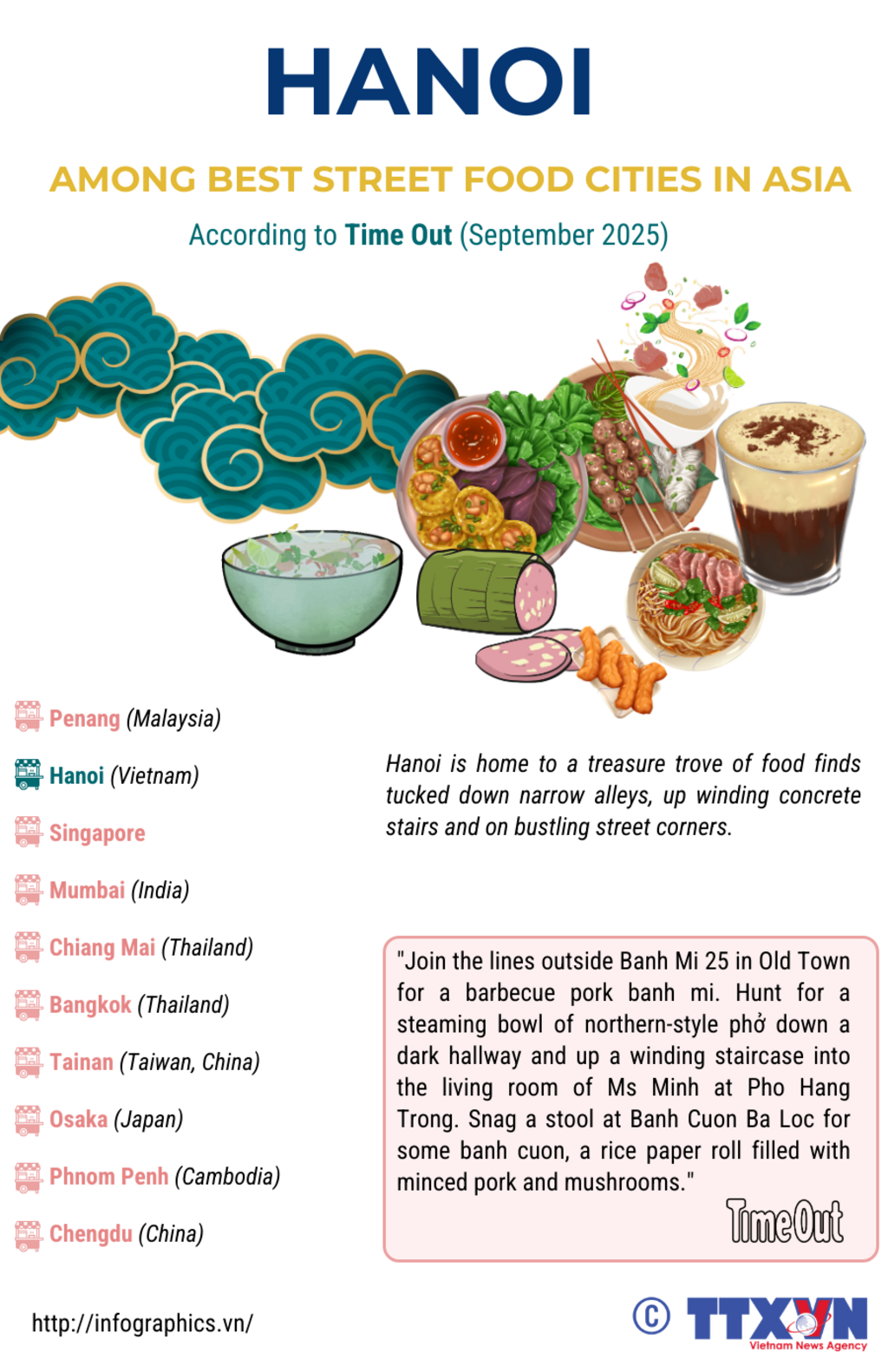 Hanoi has been listed among the top 10 Asian cities with the best street food, according to Time Out magazine.