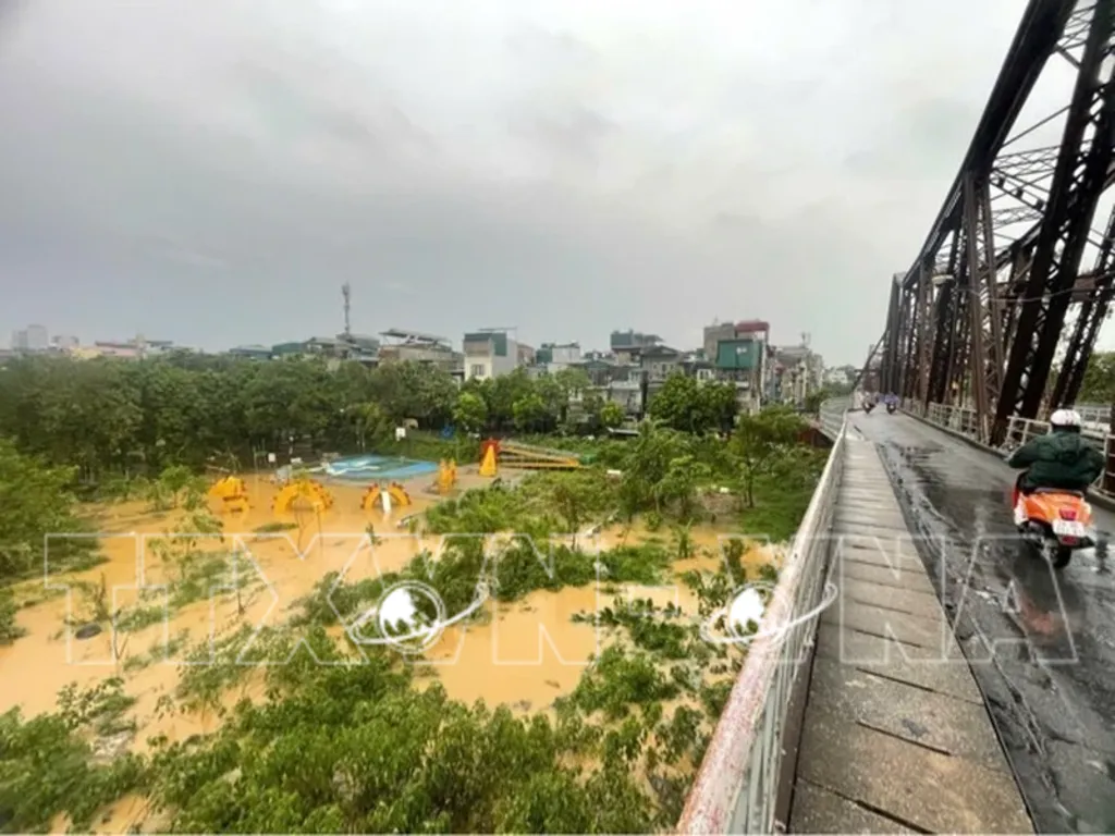 The Red River’s water level rises, coming within just 1 meter of the Long Bien bridge (photo taken early morning of September 10).__Photo: VNA