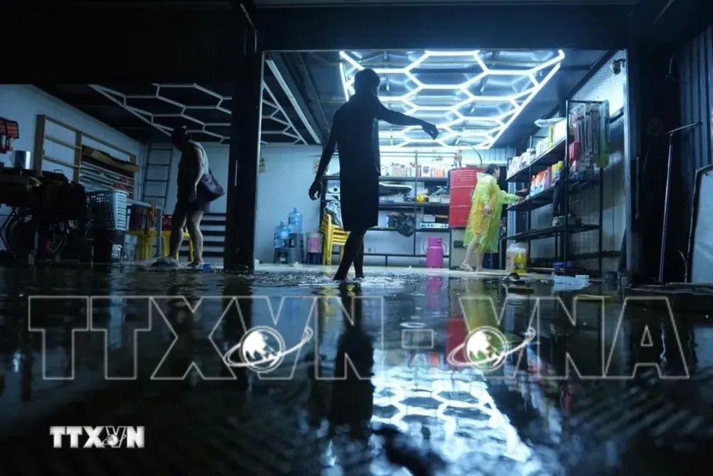 On the evening of September 9, rising river waters began flooding parts of Chuong Duong Do riverbanks. In photo: A motorbike repair shop at the 46 Chuong Duong Do parking area is affected as floodwaters inundate the premises. Street in Chuong Duong ward, particularly in low-lying areas near the Hoan Kiem district.__Photo: VNA