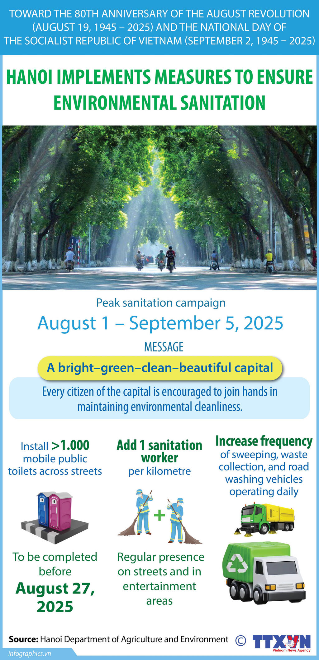 To ensure a green environment for the series of activities commemorating the 80th anniversary of the August Revolution (August 19, 1945-2025) and the National Day (September 2, 1945-2025), Hanoi has launched a range of environmental sanitation measures.