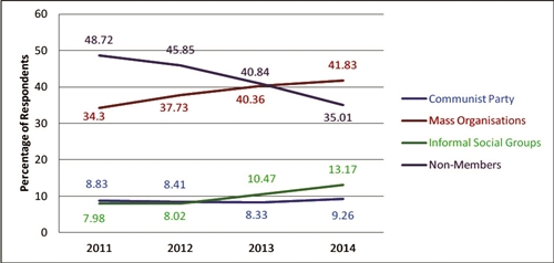 People participate in public life largely through groups of all kinds: formal associations, informal social gatherings, and many intermediary forms. Vietnamese citizens participate in a wide array of mass organizations and informal social groups at the grassroots level. Annual PAPI survey data since 2011 indicates that associational membership may be increasing nationwide over time (see Figure 1).