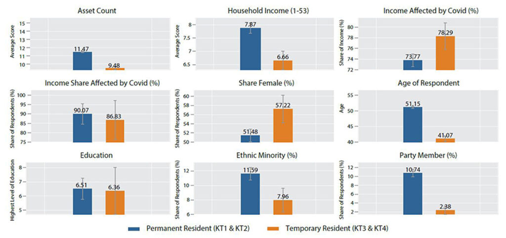 Findings from the 2022 survey show that, there are clear differences between the demographics of migrants and permanent residents, similar to findings in 2021.[5] As Figure 1 reveals, migrants tend to be poorer with fewer household assets and marginally less income than residents. They are younger on average, less educated and more likely to be women. Most dramatically, they are significantly less connected to people of political influence as only 2.4 percent are likely to be Party members, compared to 10.7 percent in the permanent resident sample.
