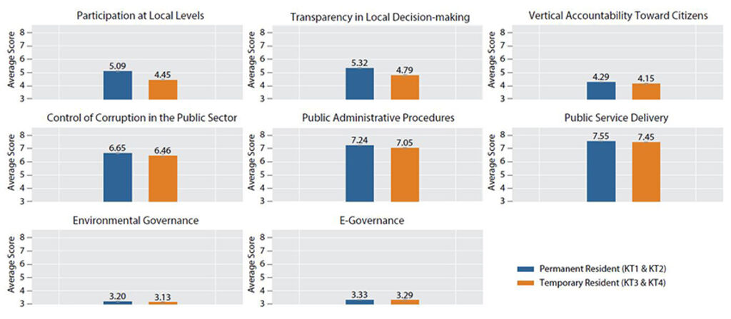 A deeper look into all governance and public administration dimensions, as experienced by the two groups in receiving provinces in 2022, reveals differences in all eight PAPI dimensions as seen in Figure 3. These resident-migrant contrasts were largest in the two dimensions of Participation at Local Levels and Transparency in Local Decision-making, similar to the 2021’s findings.[6]