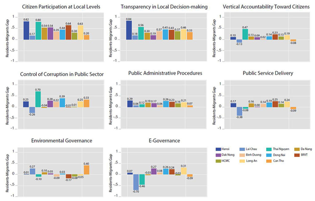 The gaps varied by provinces of destination in 2022. Migrants in Hanoi tend to be a lot less inclusive in Participation at Local Levels, Transparency in Local Decision-making and Public Administrative Procedures than in other 10 provinces. The differences are felt less by migrants in Binh Duong province. Migrants in Lai Chau and Thai Nguyen had more favorable feedback on E-Governance in 2022 than those in other nine provinces.