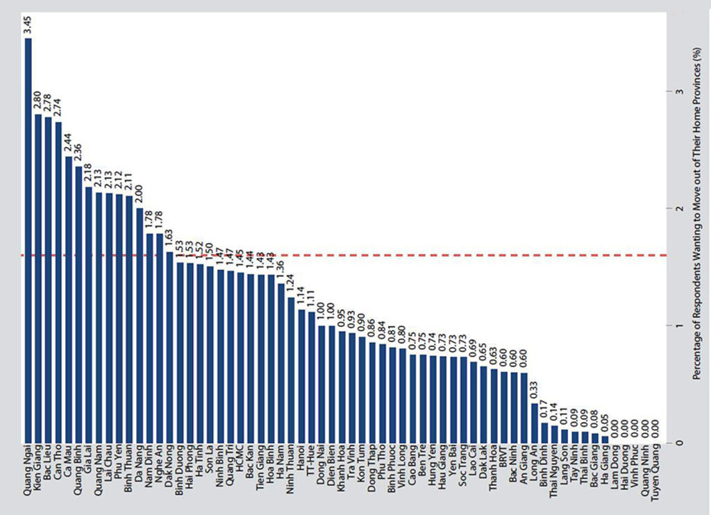 Among all 63 provinces, Quang Ngai emerged as the province with the most citizens (3.45 percent) wanting to migrate domestically, replacing Dak Nong as the province with the greatest number of citizens wanting to move out in 2021. Then came the Mekong River Delta provinces of Kien Giang, Bac Lieu, Can Tho and Ca Mau. Interestingly, Can Tho became the sixth most preferred destination for many respondents in 2022 (Figure 9).