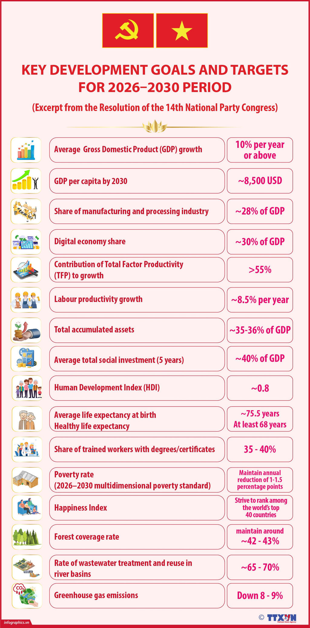 The 14th National Party Congress set the goal of achieving an average annual growth rate of gross domestic product (GDP) of 10 per cent or more; and a GDP per capita of approximately USD 8,500 by 2030.