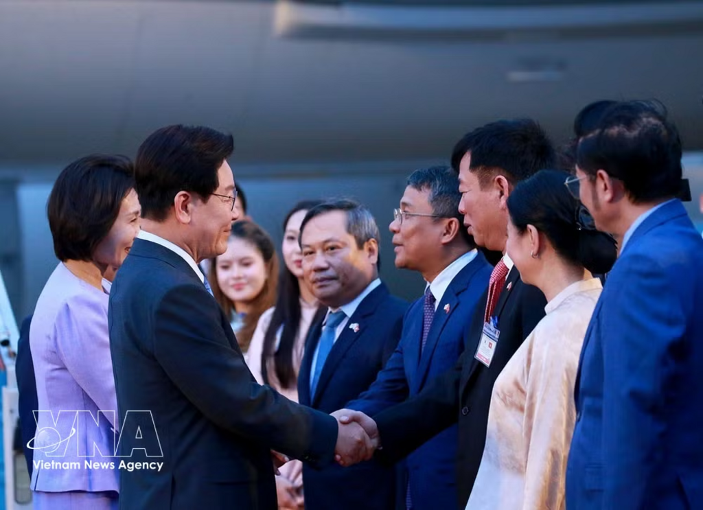 | President of the Republic of Korea (RoK) Lee Jae Myung and his spouse are welcomed at Noi Bai International Airport in Hanoi__Photo: VNA |