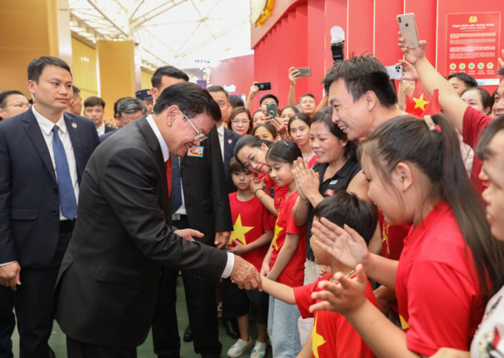 | Party General Secretary and President of Laos Thongloun Sisoulith meets Vietnamese people at the exhibition__Photo: VNA |