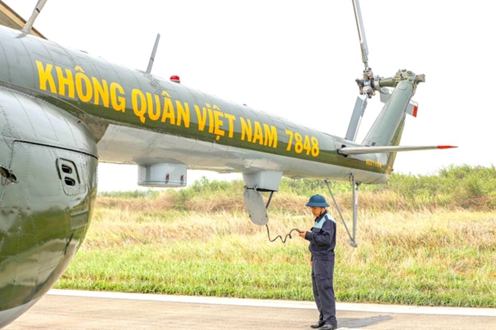 | An engineer checks on the technical status of a helicopter of the national air defense force__Photo: VNA |
