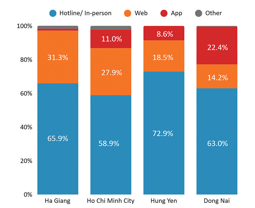 Limited channels for receiving feedback and complaints negatively impact platform spread. Although the use of websites and mobile apps is increasingly common, hotlines continue to play a crucial role in the uptake of feedback and complaints. In many provinces where the 1022 hotline is in operation, the majority of feedback and complaints are received via phone calls, thanks to their availability, ease of use and speed (see Figure 2). Moreover, a significant proportion of citizens still lack experience in using digital platforms to interact with local authorities[7]. Consequently, the absence of a dedicated hotline - as currently observed in several northern provinces, including Bac Ninh[8], Thai Nguyen, Dien Bien, Lai Chau, and Cao Bang - can substantially restrict access to feedback and complaint systems.