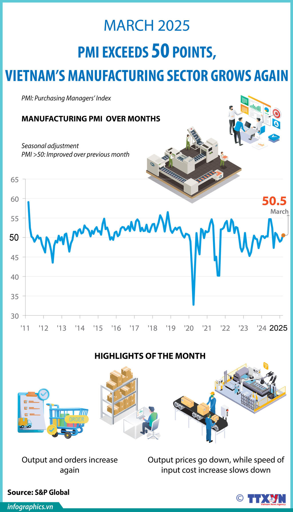 Vietnam’s Purchasing Managers’ Index (PMI) hit 50.5 points in March, up slightly compared to February (49.2 points) and exceeded the 50-point threshold for the first time after 4 months. This signals improvements in business conditions by the end of the first quarter of 2025.