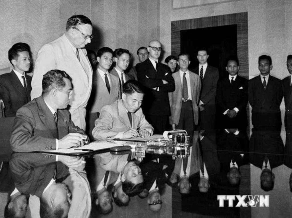 | Deputy Minister of National Defense Ta Quang Buu (sitting, right), of the delegation of the Democratic Republic of Vietnam, and French General Henri Delteil, Acting Commander-in-chief of the French Union forces in Indochina, sign the agreement on the cessation of hostilities in Vietnam.__File photo: VNA |