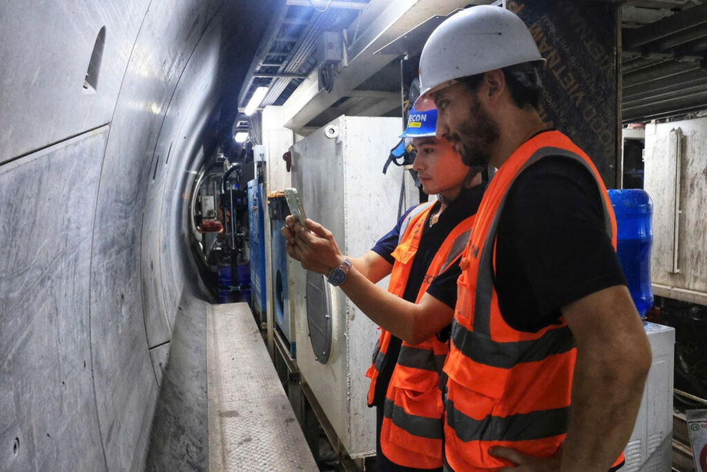 | A Vietnamese expert works with a foreign specialist inside the tunnel of the Nhon - Hanoi Railway Station metro line__Photo: VNA |