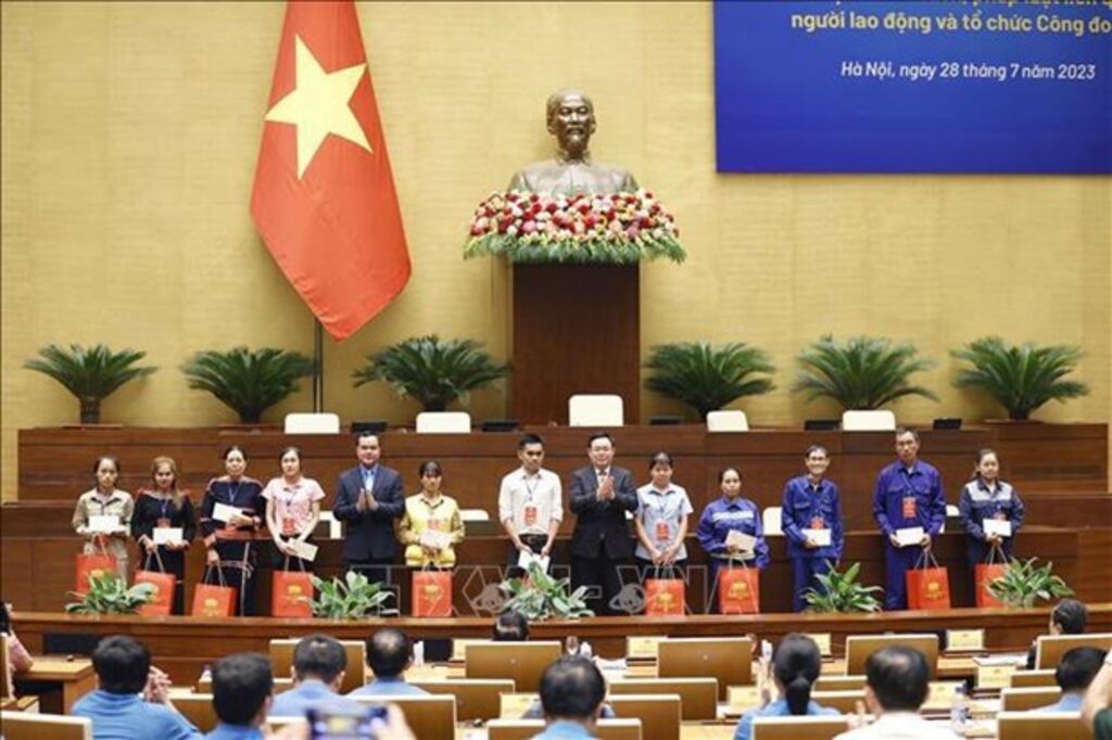 | NA Chairman Vuong Dinh Hue presents gifts to outstanding trade union members and disadvantaged laborers__Photo: VNA/VLLF |