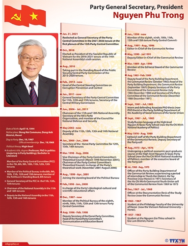 | Members of the 13th Party Central Committee’s Political Bureau 1. Nguyen Phu Trong, Party General Secretary and President; 2. Prime Minister Nguyen Xuan Phuc; 3. Pham Minh Chinh, head of the Party Central Committee’s Organization Commission; 4. Vuong Dinh Hue, Secretary of the Hanoi Party Committee and head of the Hanoi delegation of 14th National Assembly deputies; 5. Truong Thi Mai, head of the Party Central Committee’s Mass Mobilization Commission; 6. Vo Van Thuong, head of the Party Central Committee’s Commission for Communication and Education; 7. Pham Binh Minh, Deputy Prime Minister and Foreign Minister; 8. Nguyen Van Nen, Secretary of the Ho Chi Minh City Party Committee; 9. To Lam, Minister of Public Security; 10. Phan Dinh Trac, head of the Party Central Committee’s Commission for Internal Affairs; 11. Tran Cam Tu, Chairman of the 12th Party Central Committee’s Inspection Commission; 12. Phan Van Giang, Chief of the General Staff of the Vietnam People’s Army and Deputy Minister of National Defense; 13. Nguyen Hoa Binh, Chief Justice of the Supreme People’s Court; 14. Tran Thanh Man, President of the Vietnam Fatherland Front’s Central Committee; 15. Nguyen Xuan Thang, Director of the Ho Chi Minh National Academy of Politics and Chairman of the Party Central Committee’s Theoretical Council; 16. Luong Cuong, Chairman of the General Department of Politics under the Vietnam People’s Army; 17. Tran Tuan Anh, Minister of Industry and Trade and deputy head of the Party Central Committee’s Economic Commission; 18. Dinh Tien Dung, Minister of Finance. |