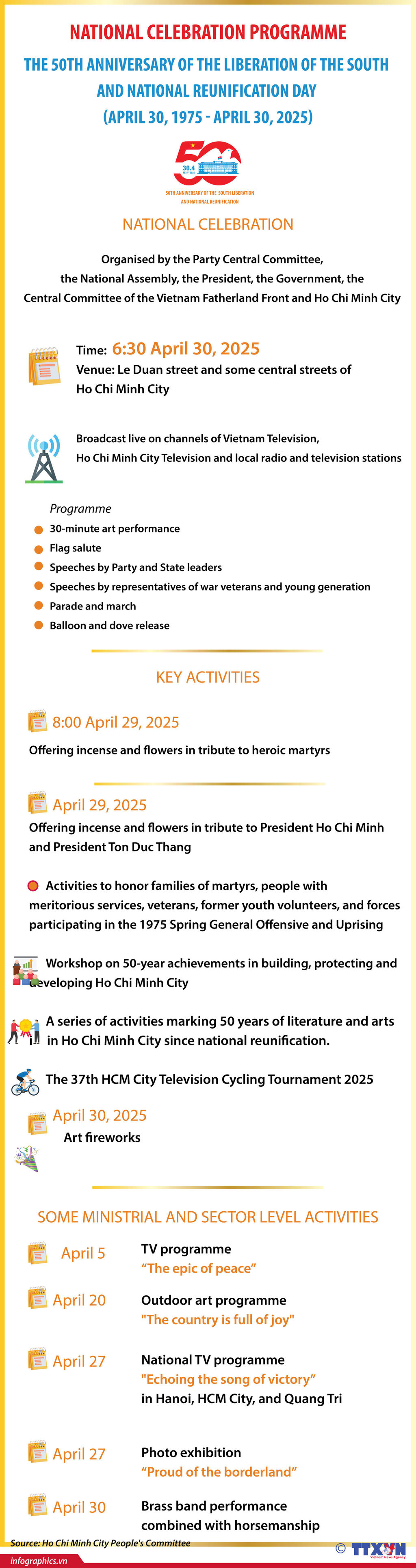 A national program with a wide range of activities will be held by the Party Central Committee, the National Assembly, the President, the Government, the Central Committee of the Vietnam Fatherland Front, and Ho Chi Minh City to celebrate the 50th anniversary of the Liberation of the South and National Reunification.