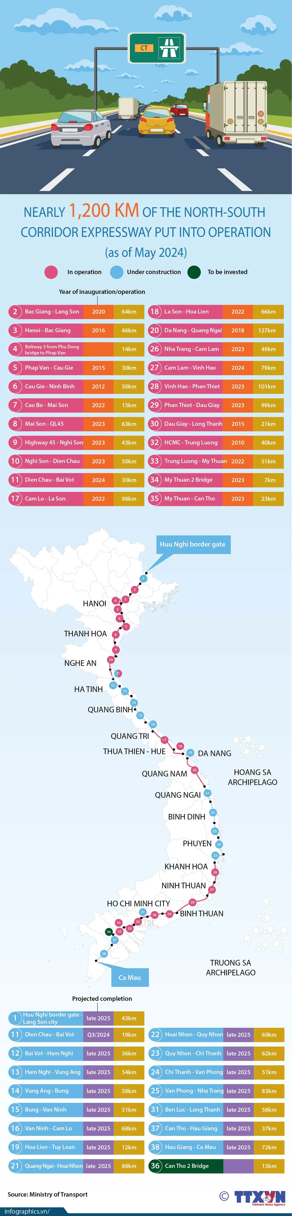 The North-South corridor expressway, running from Huu Nghi border gate to Ca Mau, is 2,063 km long as designed. As of May 2024, a total of 1,187 km have been put into operation, 861 km are under construction, and the remaining 15 km are under preparation for investment.