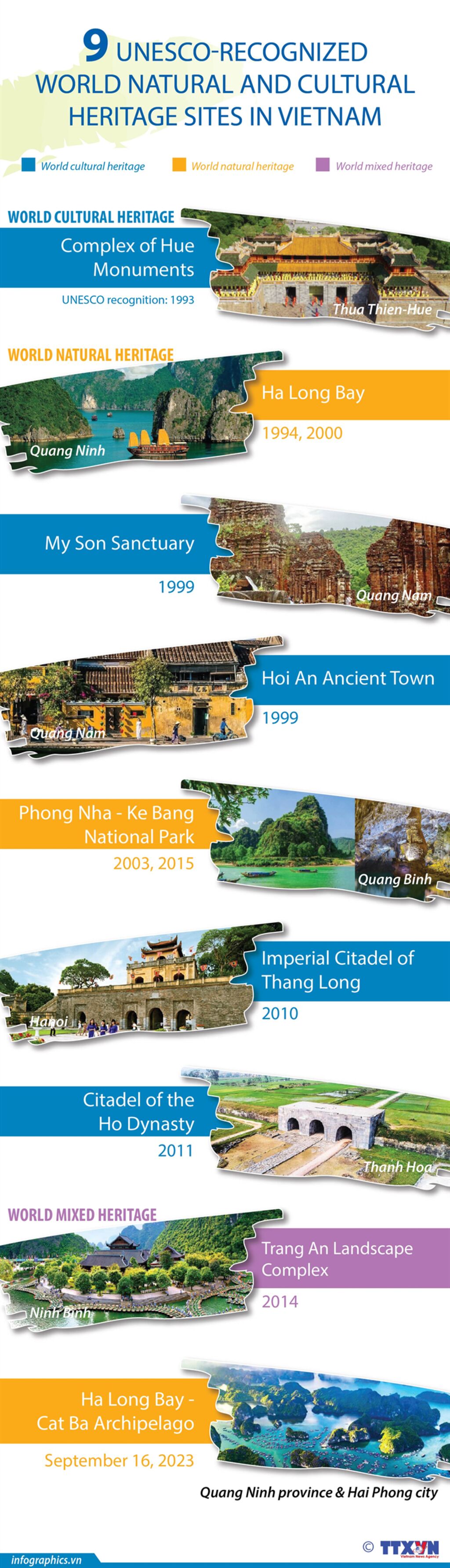 Vietnam has 9 heritage sites recognized by UNESCO, including 5 cultural, 3 natural, and 1 complex heritage items.