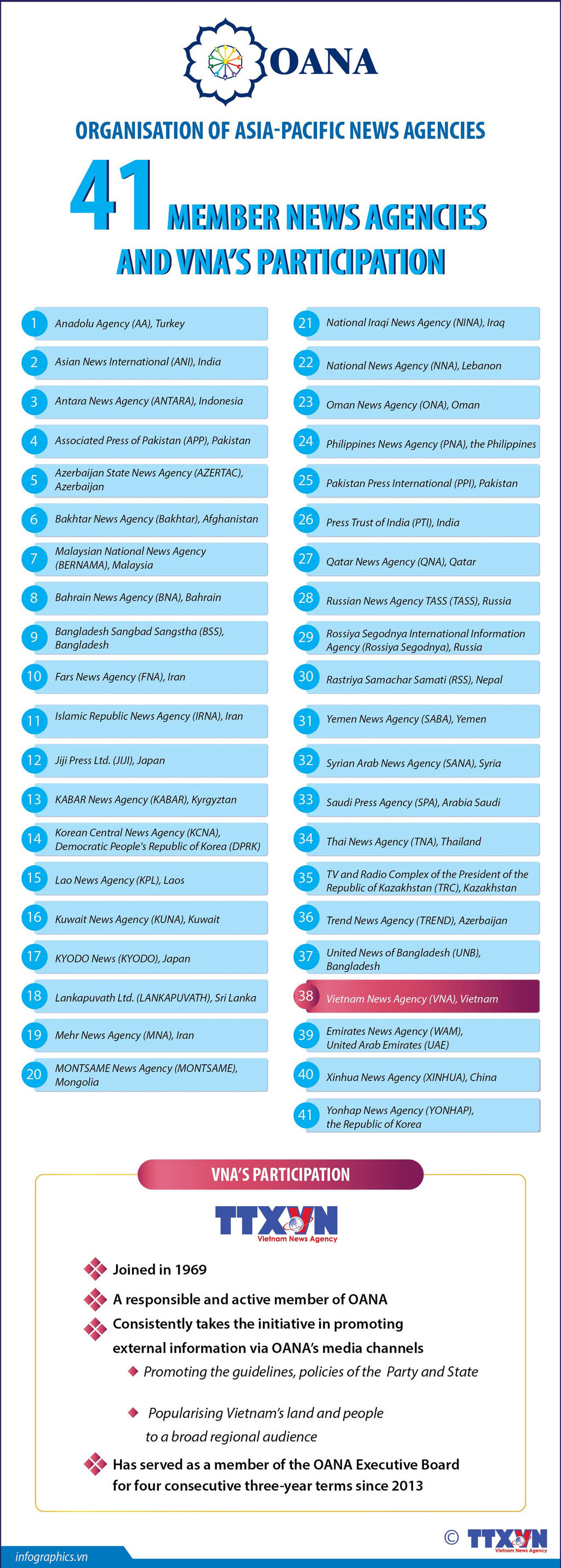 The Organization of Asia-Pacific News Agencies (OANA), founded by UNESCO in 1961 in Bangkok, brings together 41 member agencies from 35 countries, producing two-thirds of the world’s news output. The Vietnam News Agency (VNA), a member since 1969, has actively contributed to OANA and served on its Executive Board for four consecutive terms since 2013.