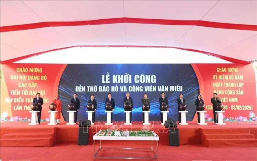 | Party General Secretary To Lam (center) and officials press the button to launch the construction of the Ho Chi Minh Temple and Van Mieu park in Bac Ninh city.__Photo: VNA |