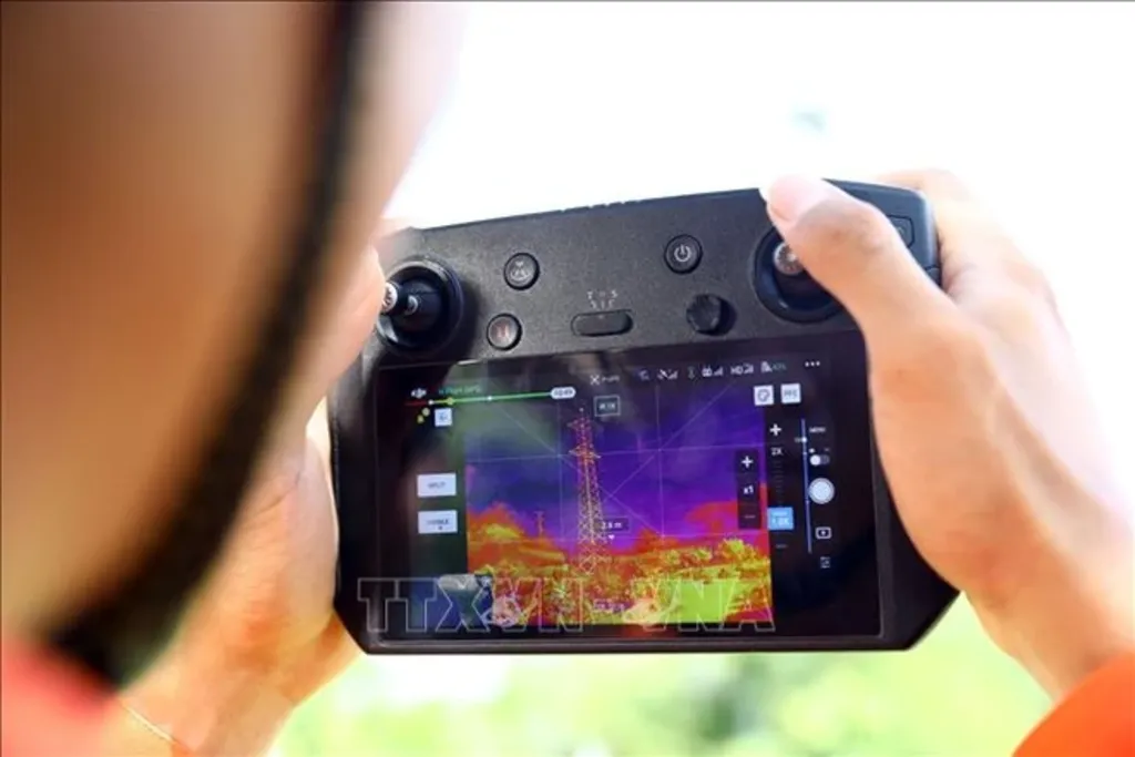 | A worker of Binh Dinh Power Transmission use a unmanned aerial vehicle (UAV) with a thermal imaging camera to check the heat emission of equipment on the power line__Photo: VNA |
