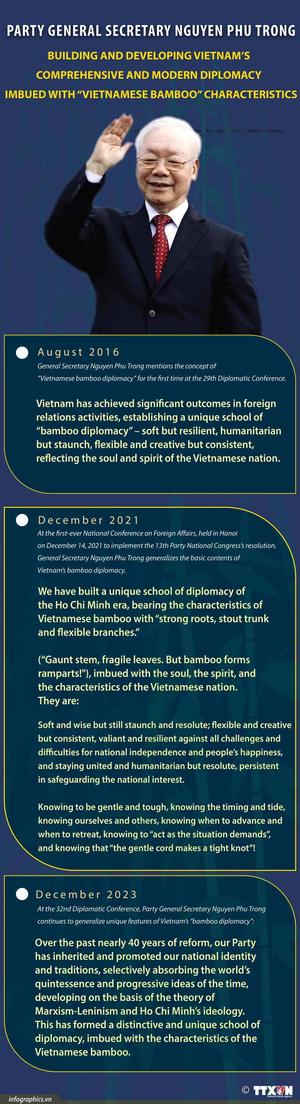 The idea of bamboo diplomacy was first coined by Party General Secretary Nguyen Phu Trong at the 29th Diplomatic Conference in Hanoi (2016), and reiterated at the first National Conference on Foreign Affairs in Hanoi (2021). Vietnam has built a unique school of diplomacy of the Ho Chi Minh era, bearing the characters of Vietnamese bamboo with “strong roots, stout trunk and flexible branches," imbued with the soul, the spirit, and the characters of the Vietnamese nation.