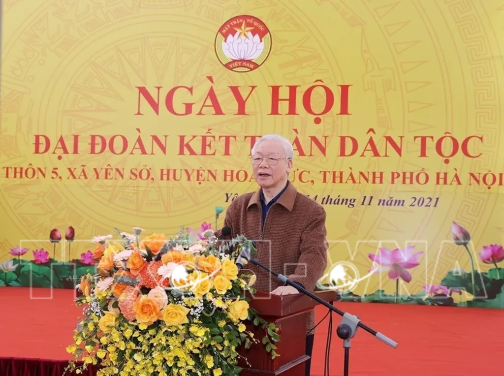 Party General Secretary Nguyen Phu Trong attends and delivers a speech at the National Great Unity Festival in Yen So commune, Hoai Duc district, Hanoi on November 14, 2021.__Photo: VNA