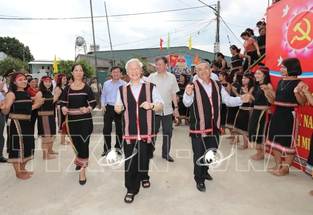 General Secretary Nguyen Phu Trong joins traditional dances of ethnic groups in Kon Ro Bang 2 hamlet, Vinh Quang commune, Kon Tum city.__Photo: VNA