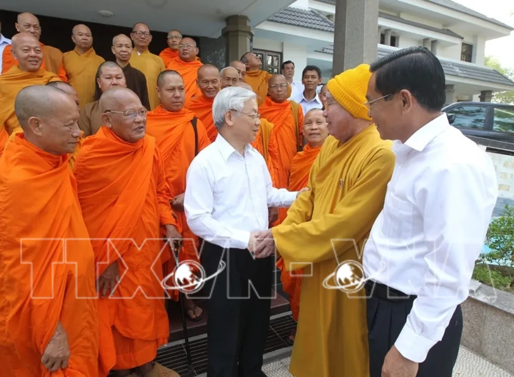 General Secretary Nguyen Phu Trong meets with representatives of the Supreme Patriarch and Executive Councils of Soc Trang province’s Buddhist Sangha on March 9, 2015.__Photo: VNA