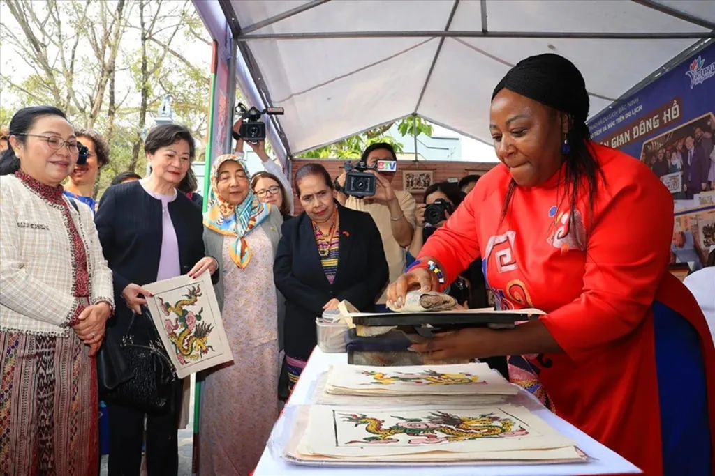 | Female ambassadors and heads of international organisations in Vietnam learn about Dong Ho painting art at Dong Ky village, Tu Son city, Bac Ninh province__Photo: VNA |