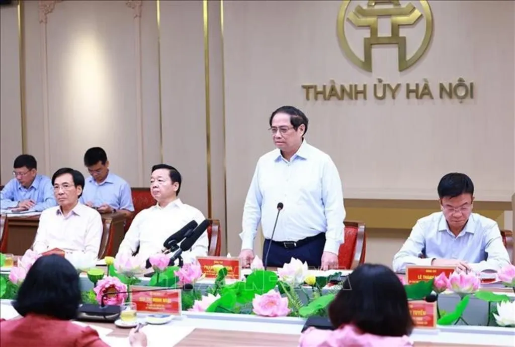 | PM Pham Minh Chinh (standing) speaks at the working session with the standing board of Hanoi Party Committee__Photo: VNA |