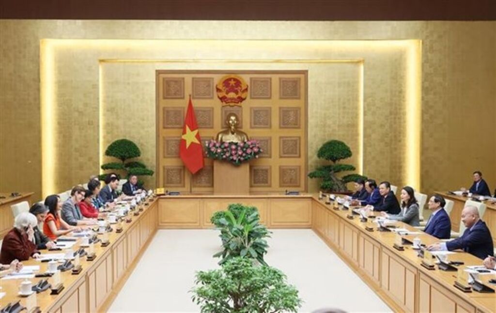 | The meeting between PM Pham Minh Chinh, UN Resident Coordinator Pauline Tamesis and representatives of UN organizations in Vietnam in Hanoi on October 24__Photo: VNA |
