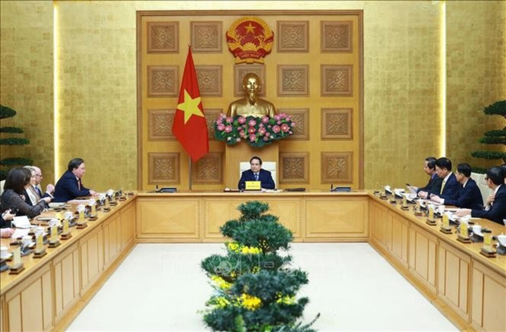 | Prime Minister Pham Minh Chinh (L) receives representatives of 21 leading US universities, who are participating in the International Academic Partnership Program (IAPP) in Vietnam.__Photo: VNA |
