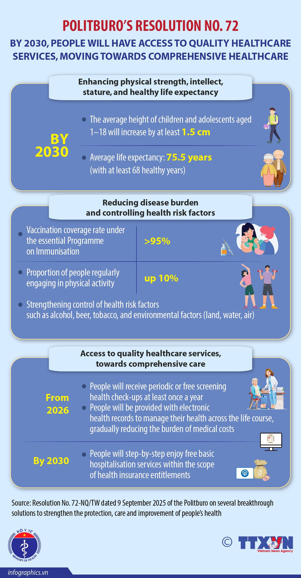 Politburo’s Resolution 72 on a number of breakthrough solutions to strengthen the protection, care, and improvement of people’s health carries special significance. It once again affirms the Party’s deep concern for the health of every citizen, with the goal of building a healthy Vietnam.