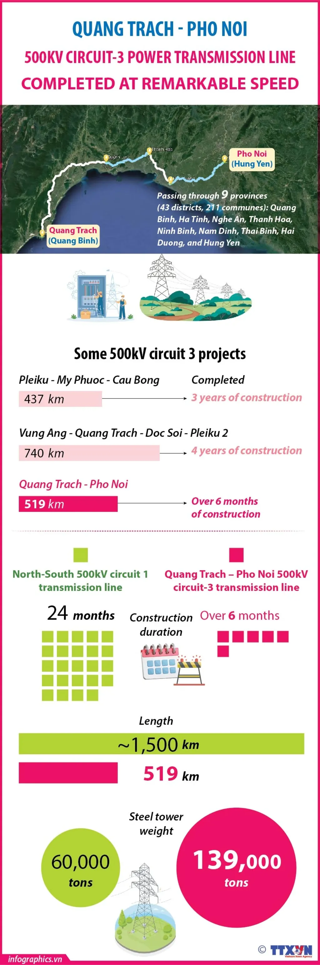 The 500kV circuit-3 power transmission line linking Quang Trach in the central province of Quang Binh and Pho Noi in the northern province of Hung Yen is a special project, completed at remarkable speed, representing a major achievement for the power sector.