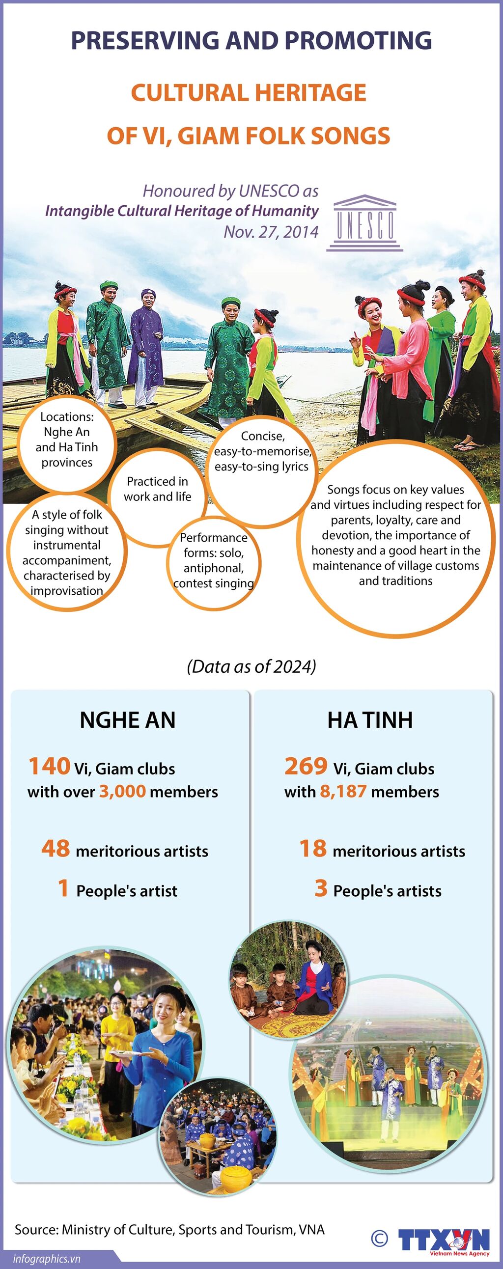 Vi and Giam songs are sung by a wide range of communities in Nghe An and Ha Tinh provinces of north-central Vietnam. They were honoured by UNESCO as intangible cultural heritage of humanity in 2014.