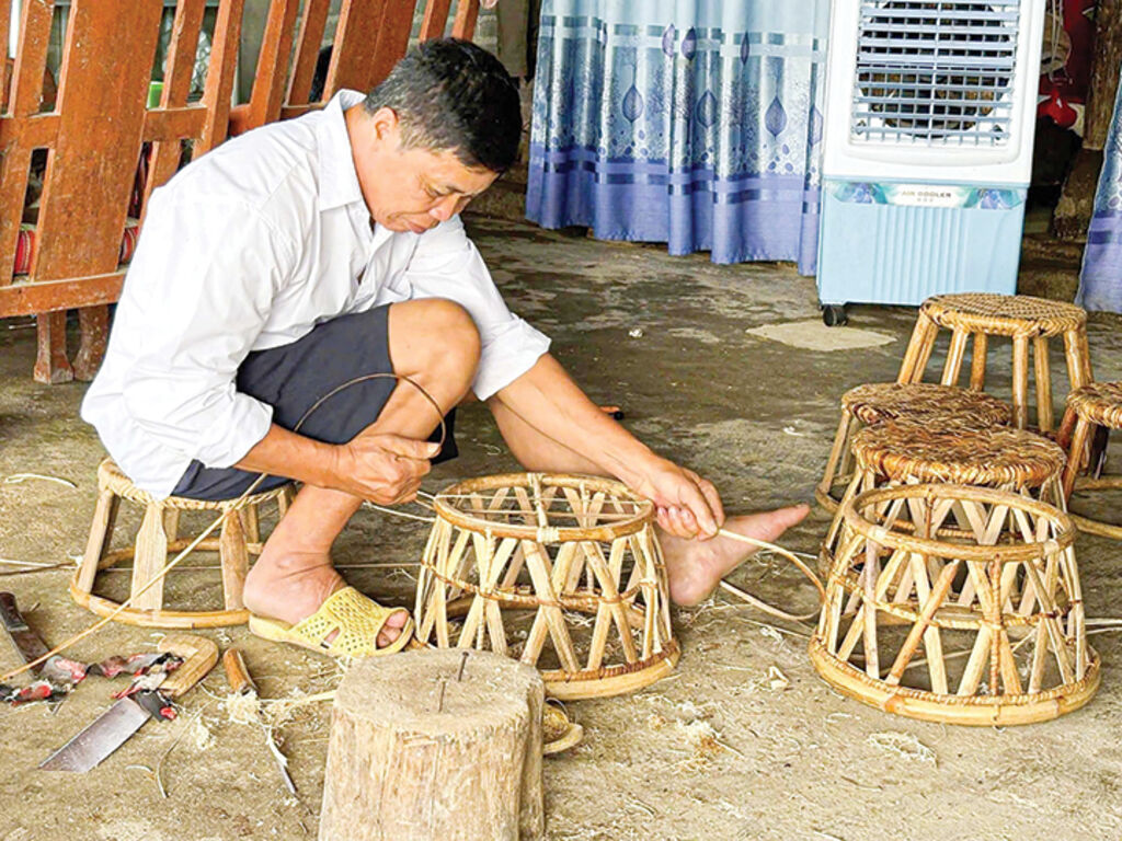 | Artisan Quang Van Phich weaves rattan stools__Photo: VNA |