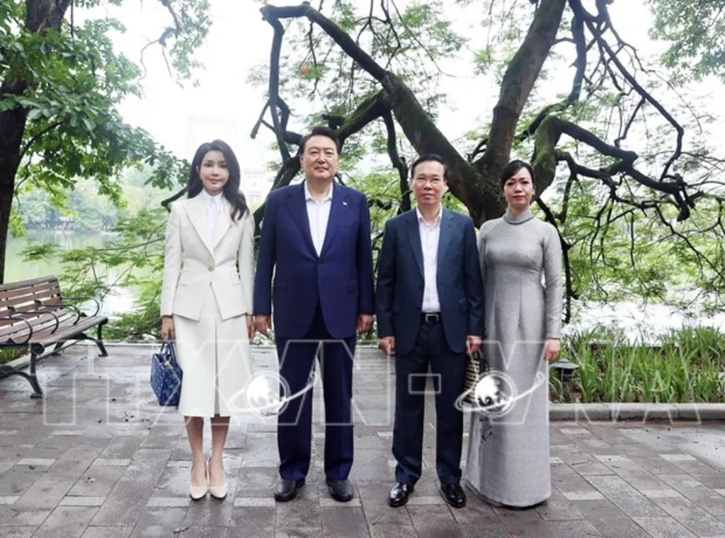 | Presidents Vo Van Thuong and Yoon Suk Yeol, together with their spouses, pose for a joint photo besides Hoan Kiem Lake, an icon of Hanoi, on June 24 morning.__Photo: VNA |