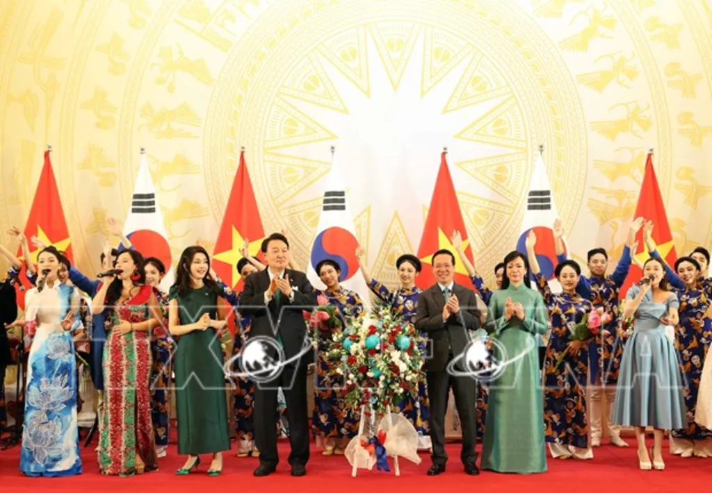 On June 23 evening, President Vo Van Thuong and his spouse hosted a banquet in honor of RoK President Yoon Suk Yeol and his spouse at the International Convention Centre in Hanoi.