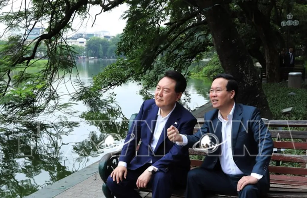 | Presidents Vo Van Thuong and Yoon Suk Yeol talk to each other besides Hoan Kiem Lake on June 24 morning__Photo: VNA |