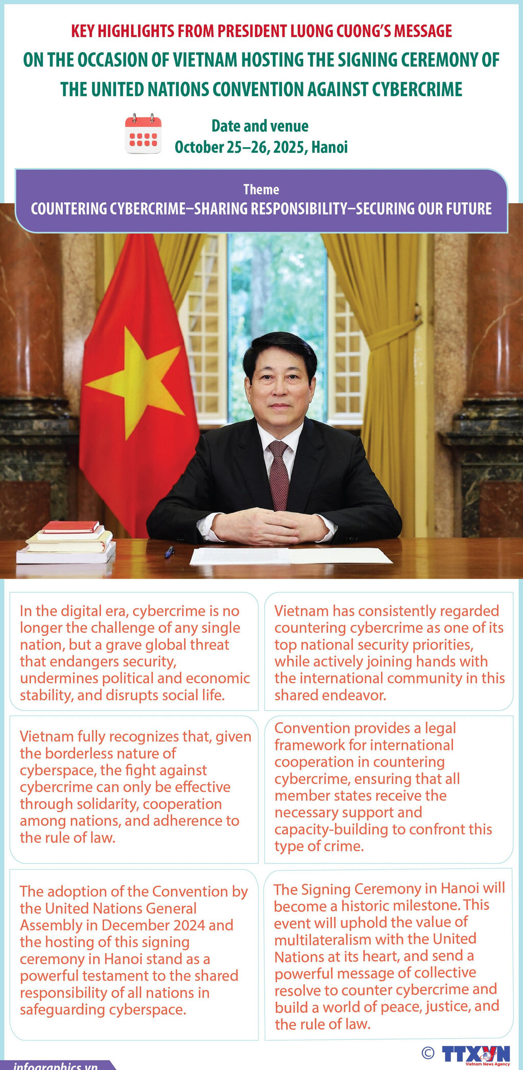President Luong Cuong has delivered a message on the occasion of Vietnam hosting the signing ceremony of the United Nations Convention against Cybercrime in Hanoi on October 25 - 26, 2025.