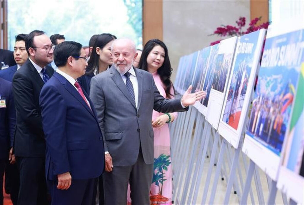 | Prime Minister Pham Minh Chinh and Brazilian President Luiz Inacio Lula da Silva visit a photo exhibition on the two countries' cooperation on the sidelines of their meeting in Hanoi on March 28__Photo: VNA |