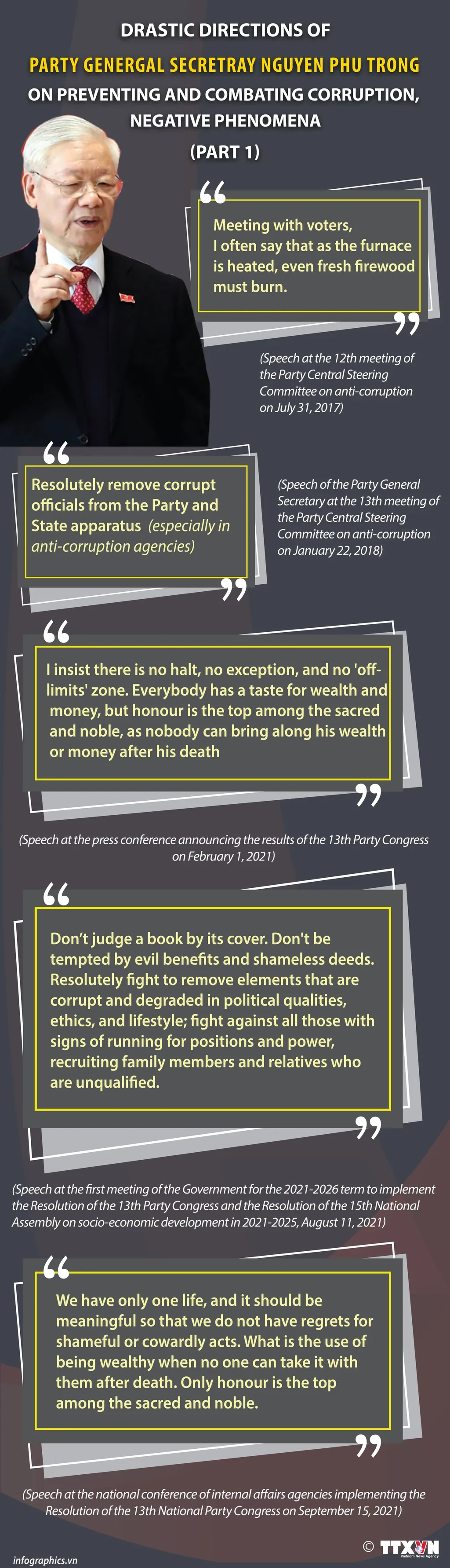 Throughout his life dedicated to the revolutionary cause of the Party and the nation, General Secretary Nguyen Phu Trong delivered impactful speeches and made profound statements on building a clean and strong Party committed to preventing and combating corruption and other negative phenomena.