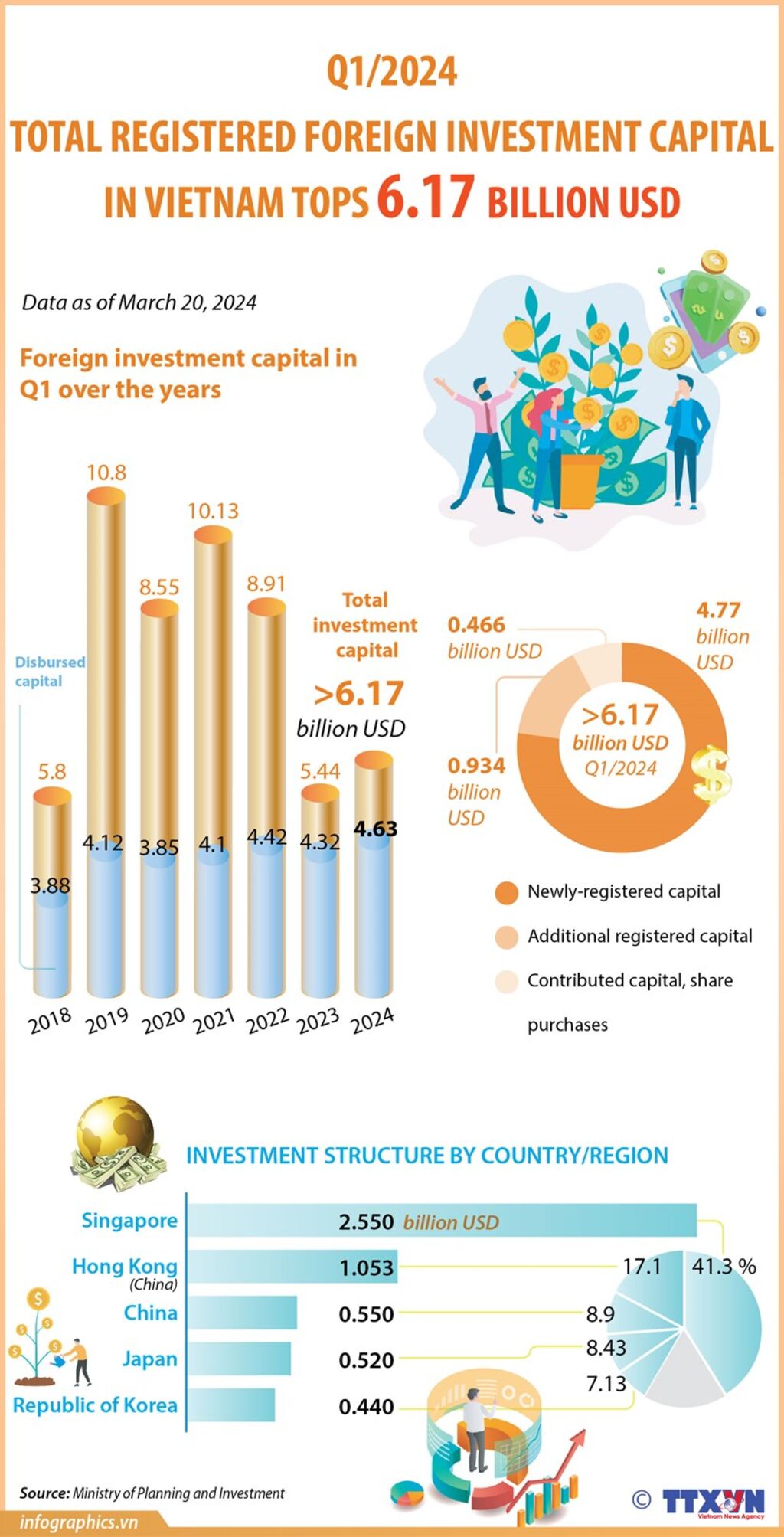As of March 20, total newly-registered, additional, and contributed capital and share purchases of foreign investors stood at more than USD 6.17 billion in 2024, a year-on-year increase of 13.4 percent.