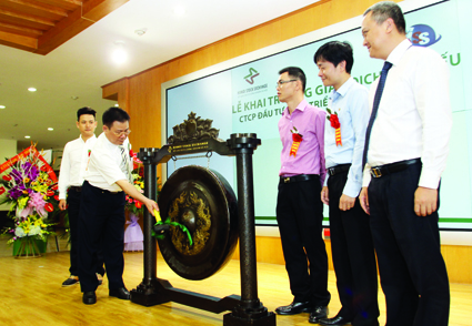 | Beating a gong to announce the listing of Soc Son Development Investment Joint-Stock Company (code DPS) on the Hanoi Stock Exchange __Photo: Tuan Anh/VNA |