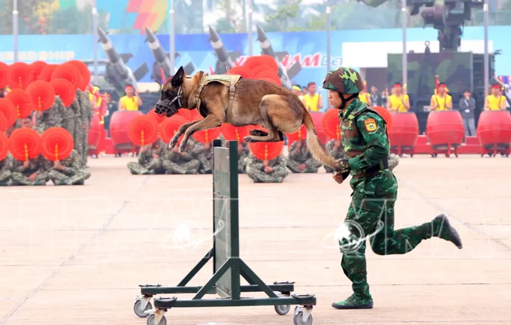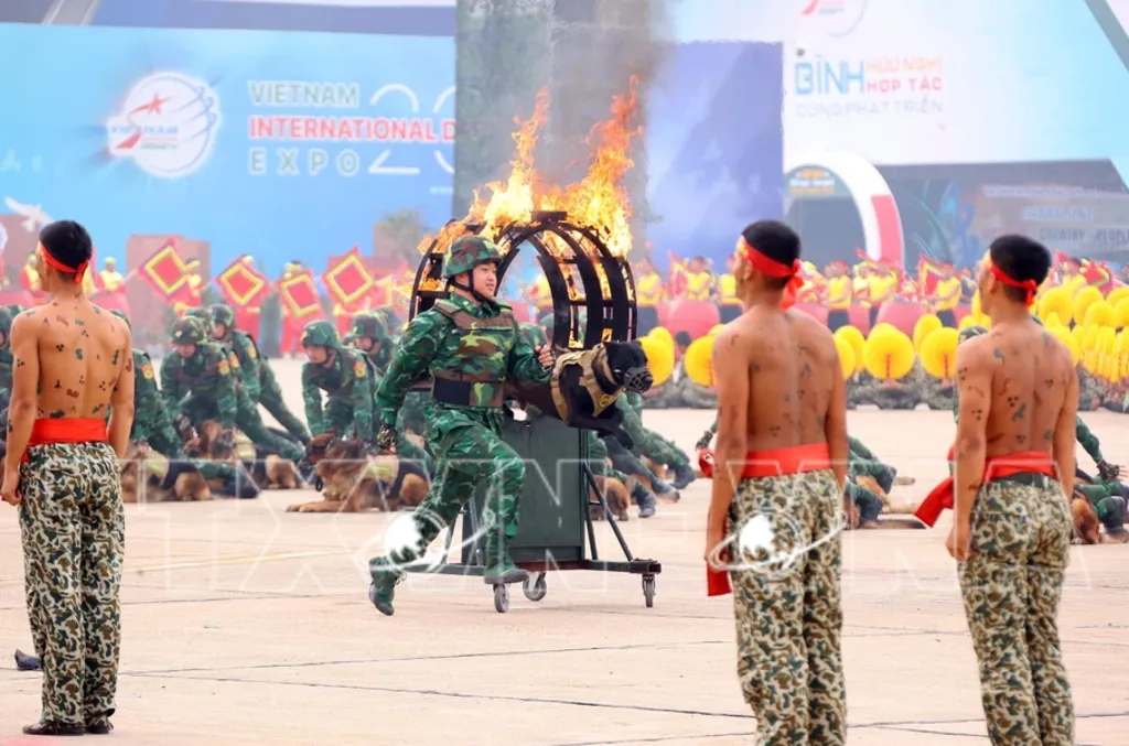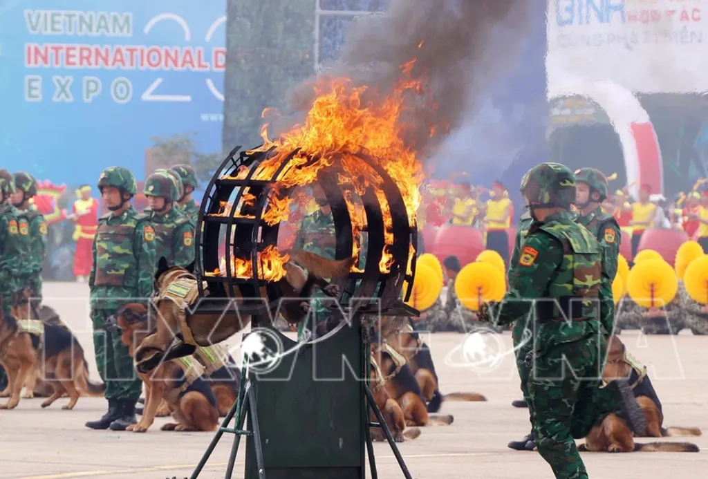 | Canine forces perform at the rehearsal for the opening ceremony of the Vietnam International Defense Expo 2024.__Photo: Van Diep/VNA |