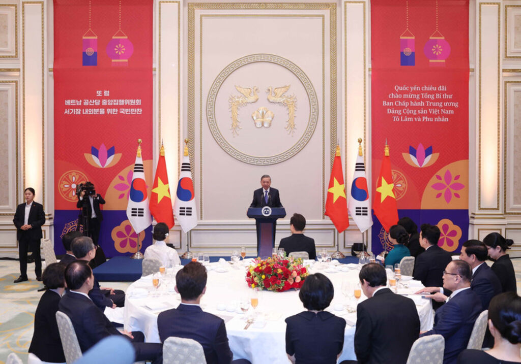 | Party General Secretary To Lam speaks at the state banquet in Seoul on August 11__Photo: VNA |